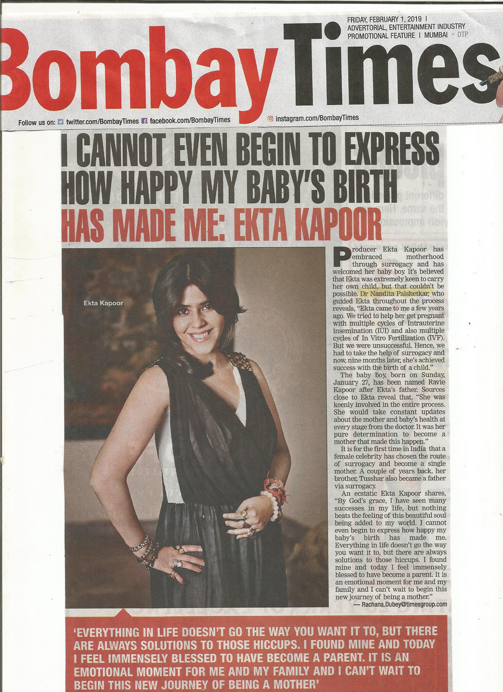 - Bombay Times - I Cannot even begin to express How Happy My Baby's Birth Has Made me : Ekta Kapoor.