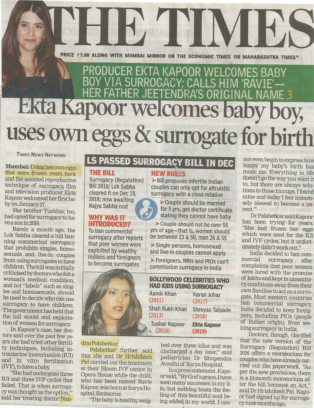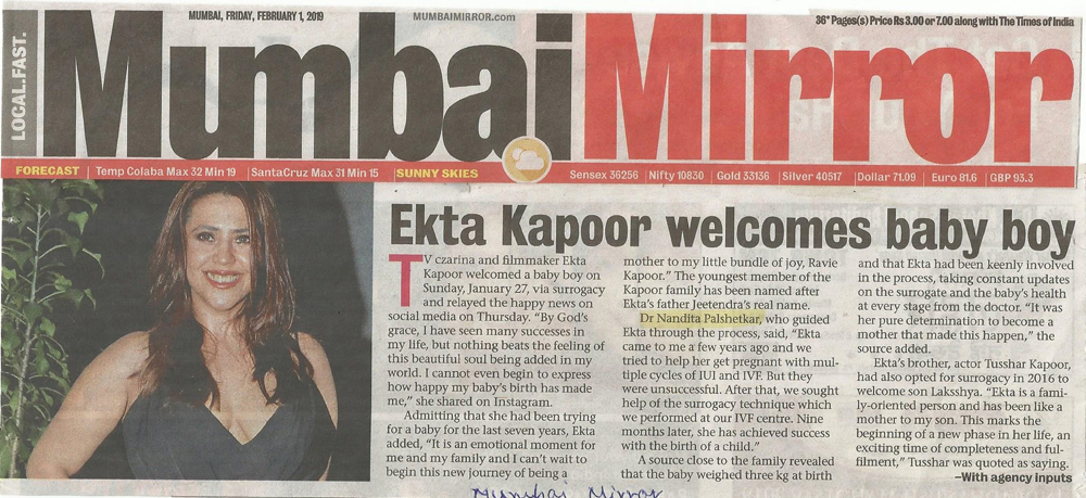 - Mumbai Mirror - Ekta Kapoor Welcomes baby boy, uses own eggs & surrogate for birth.